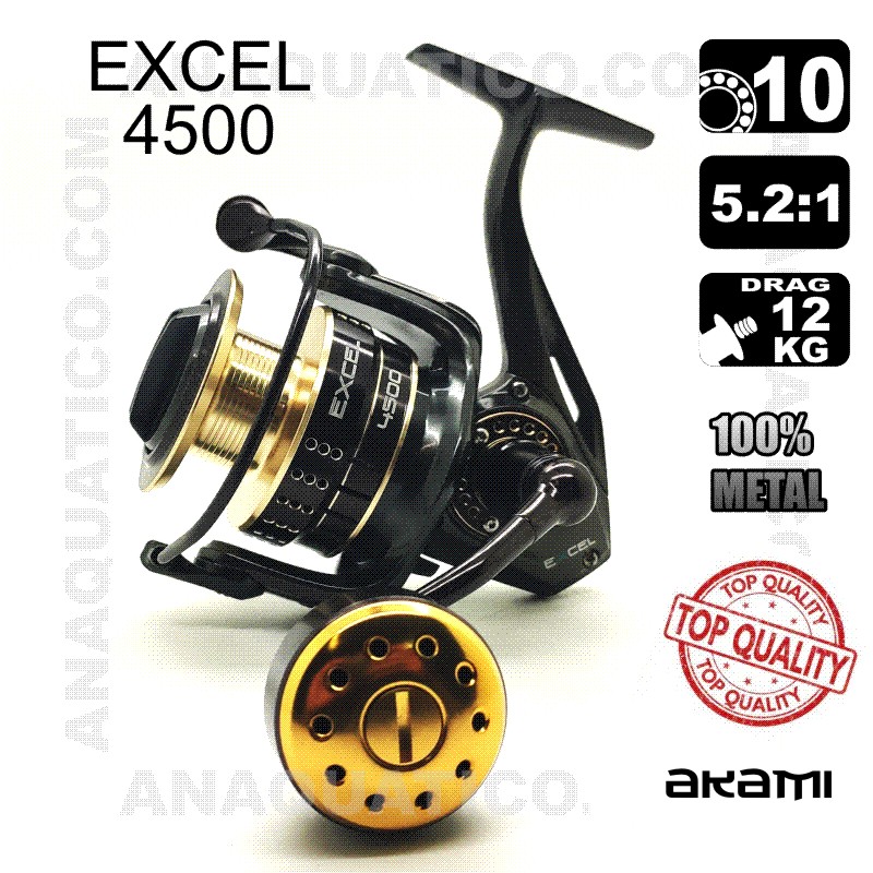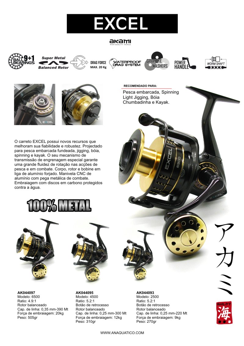 O carreto EXCEL possui novos recursos que melhoram sua fiabilidade e robustez. Projectado para pesca embarcada fundeada, jigging, bóia, spinning e kayak. O seu mecanismo de transmissão de engrenagem especial garante uma grande fluidez de rotação nas acções de pesca e em combate. Corpo, rotor e bobine em liga de alumínio forjado. Manivela CNC de alumínio com pega metálica de combate. Embraiagem com discos em carbono protegidos contra a água.